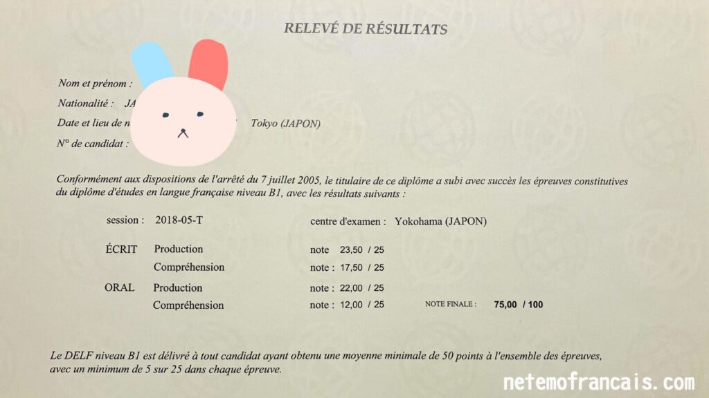 100点満点中、75点でした。DELFは50点以上で合格です。